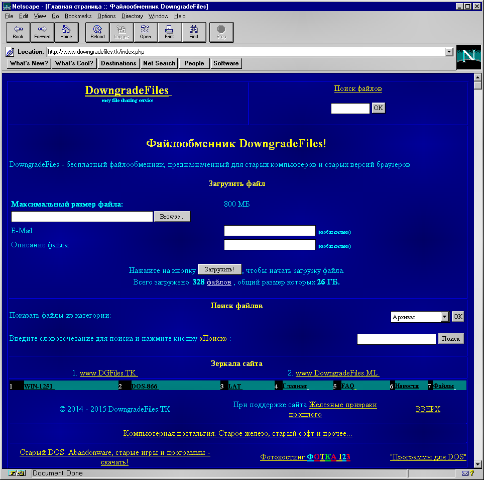 | 23.08.2014 | - полностью изменен дизайн сайта и верстка, теперь он нормально отображается даже в очень древних браузерах вроде Netscape Navigator 3.04 - 1997 год | ||||||||||||||||||||||||||||||||||||||||||||||||||||||||||||||||||||||||||||||||||||